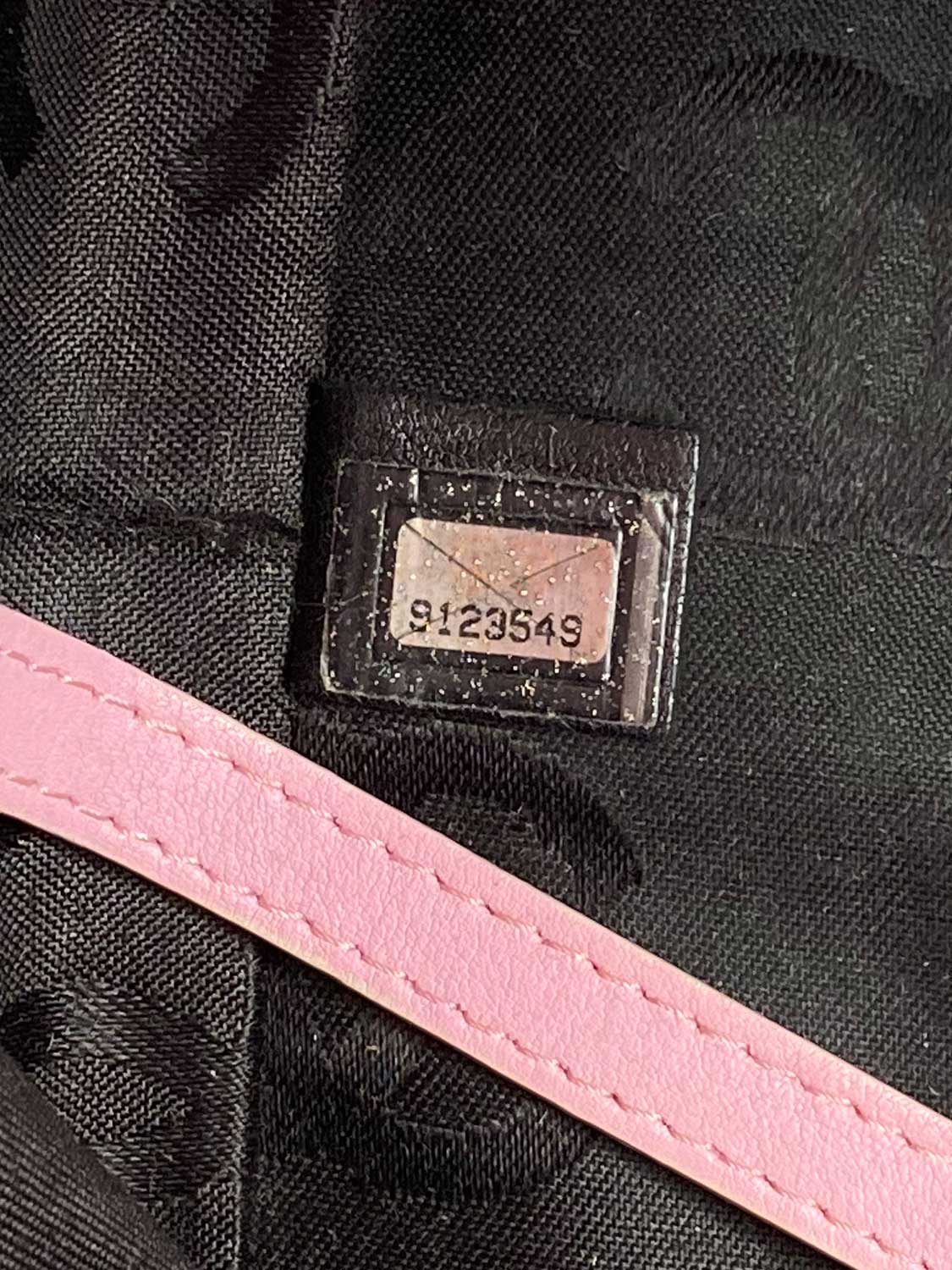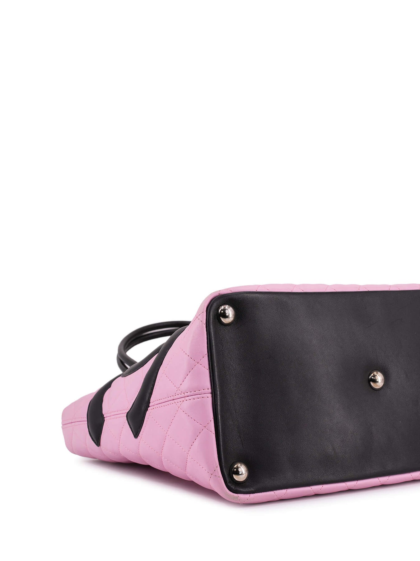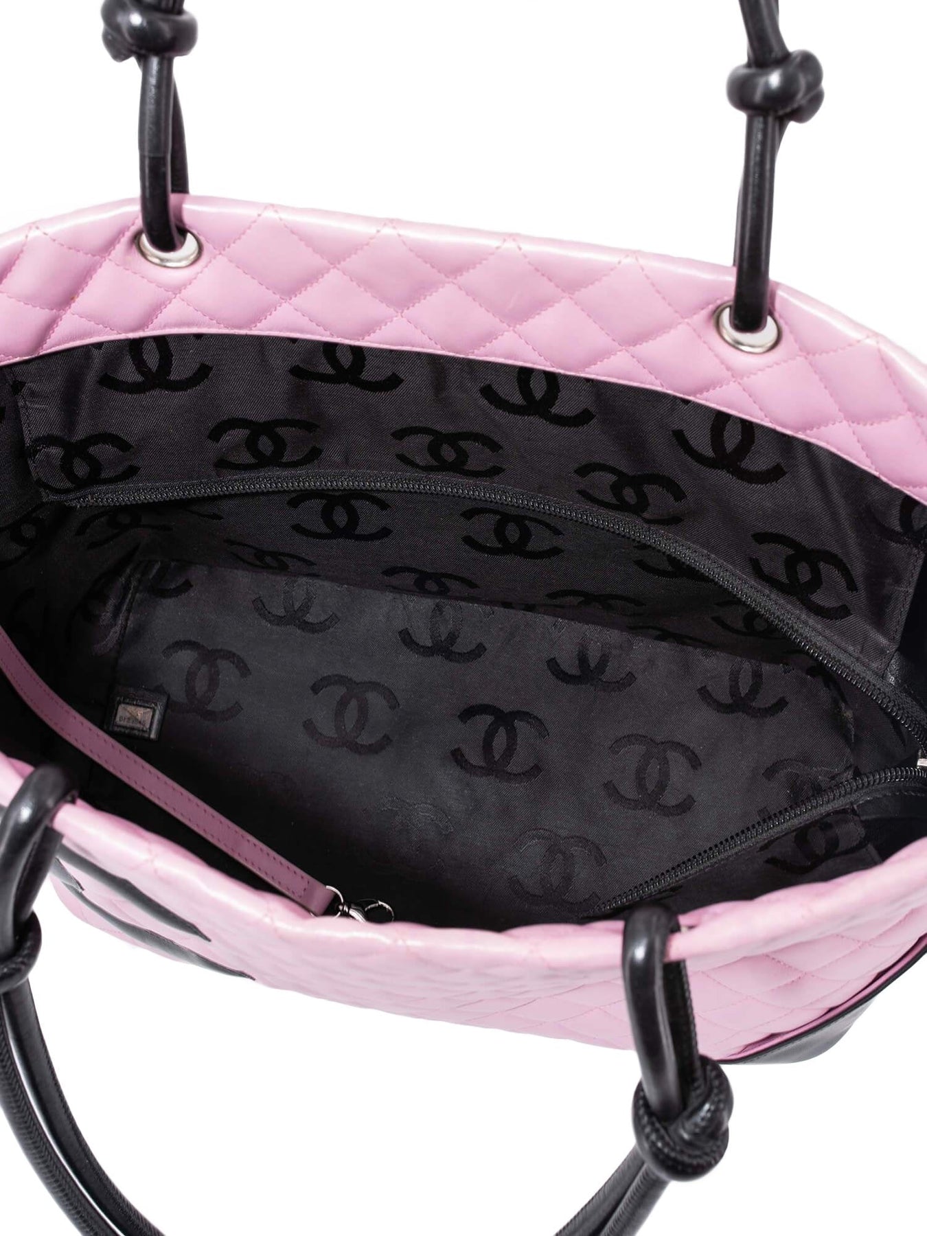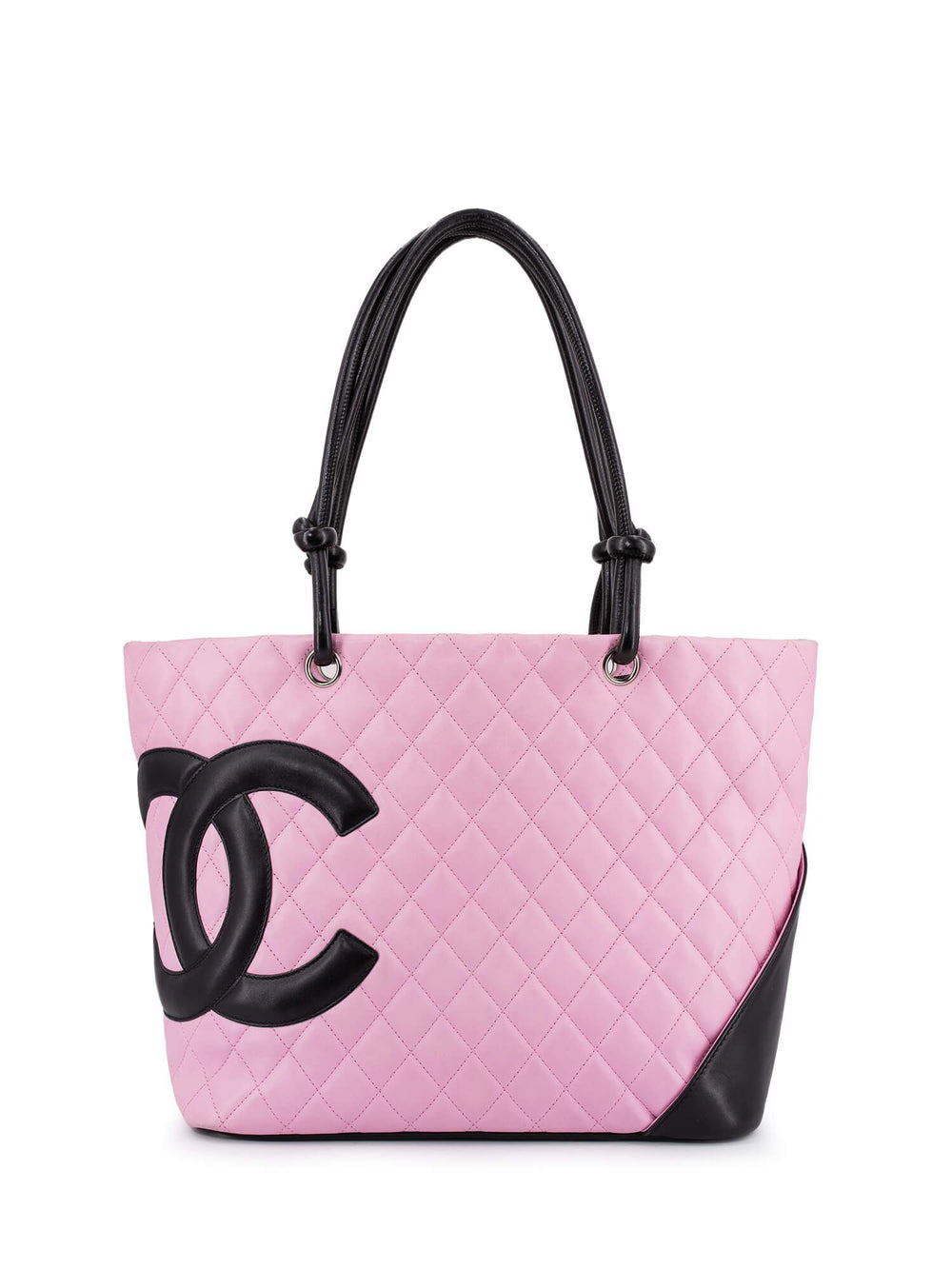 Chanel Cambon bag or . This Chanel bag is in pink quilted leather with a stitched black CC logo and rolled leather top handles. It features a black Chanel logo lined interior with one zipped pocket, top zippered closure, and one exterior rear slip pocket.