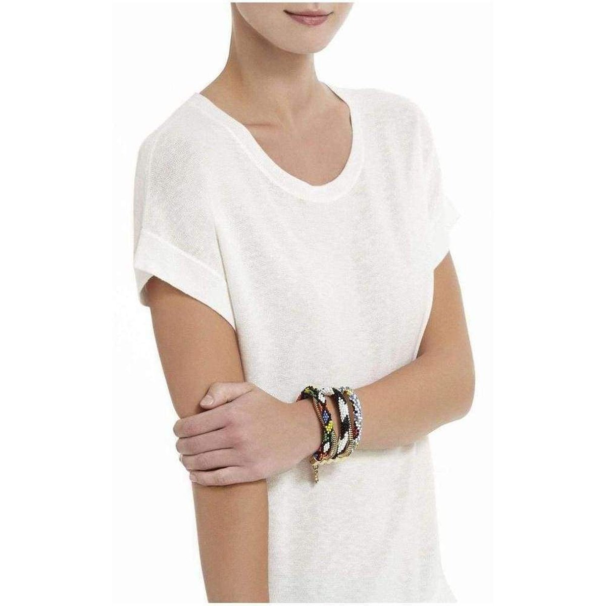 Three seed-beaded strands with contrast tribal patterns. Two wire-wrapped strands. Hardware-capped ends.