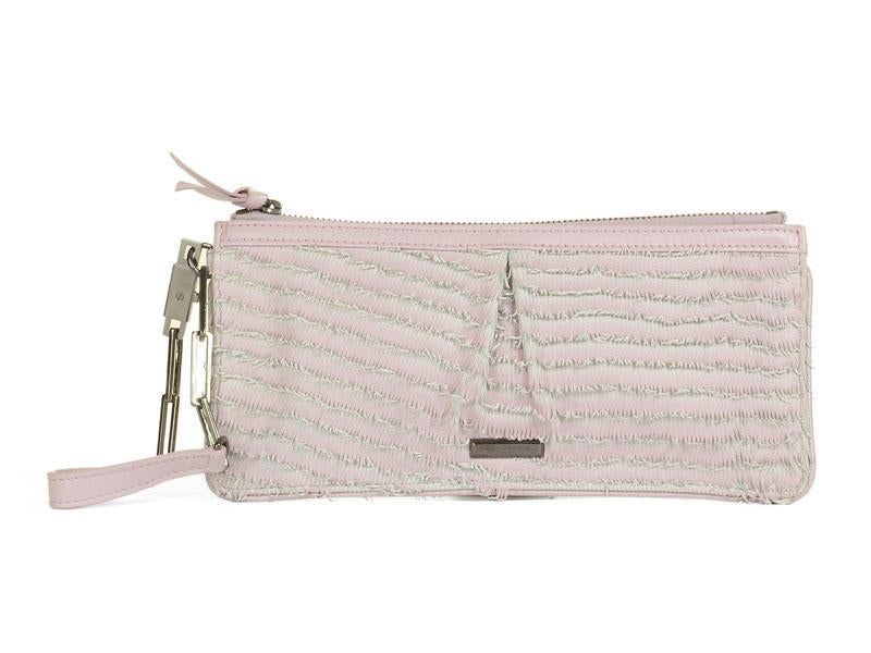 Burberry's Twilley Lilac Wristlet is like having a handful of flowers that won't wilt! Lilac leather with pleats in the center of the front and back and a logo plate on the front, it's cut into a curled fringe. Unzip the gunmetal zipper to the inside of black logo fabric. It may have been worn, since some fringe is out of place, although it could be from storage. With a five and three quarter inch drop to the chain and leather wristlet, it's a great little evening bag or you can stow it in a larger bag, pulling it out like a bouquet of lilacs - how's that for a magic trick!