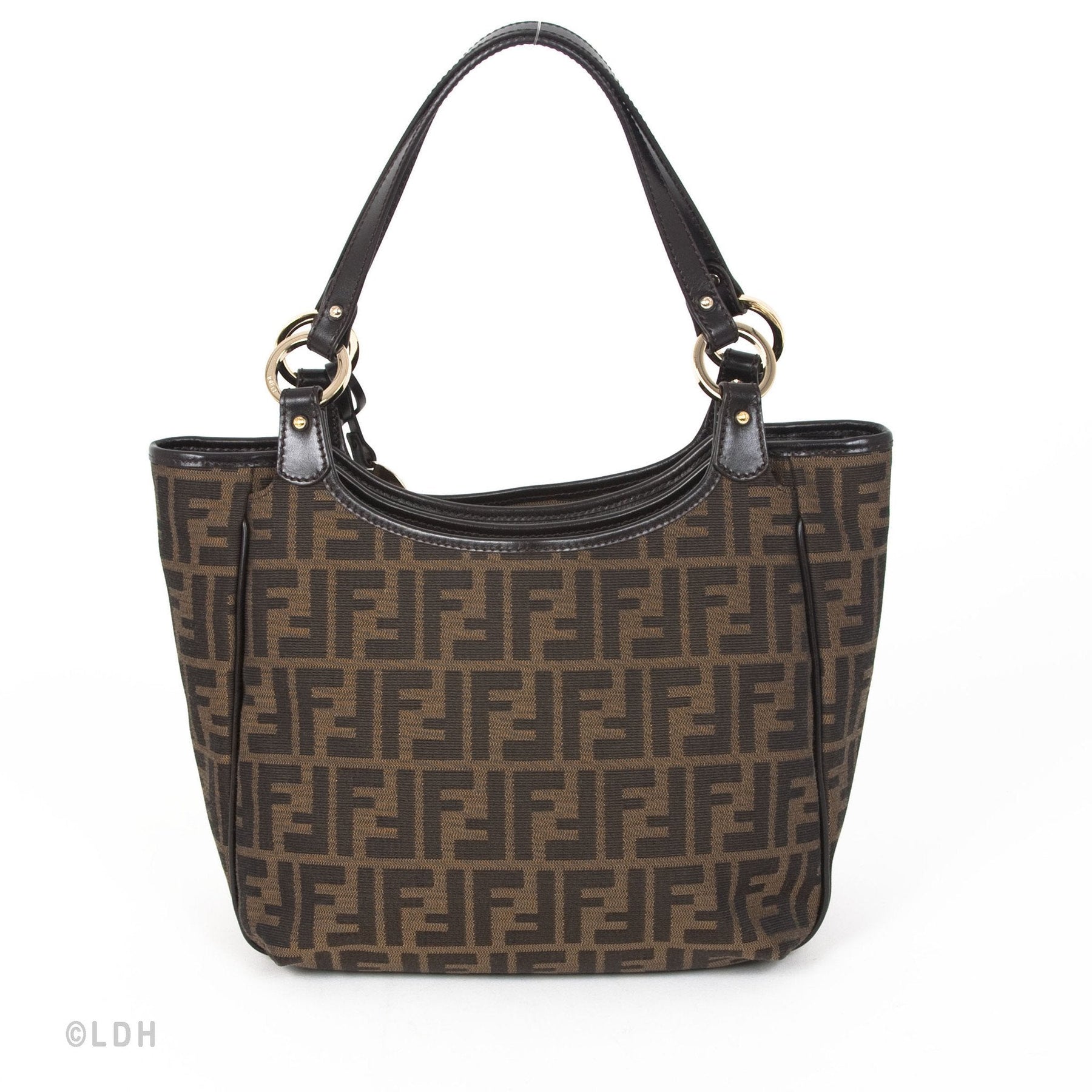 This authentic pre owned Fendi Zucca Tote features the classic FF mono exterior with brown leather trimmings. One open side pocket with zipper. Silver tone hardware and leather straps.