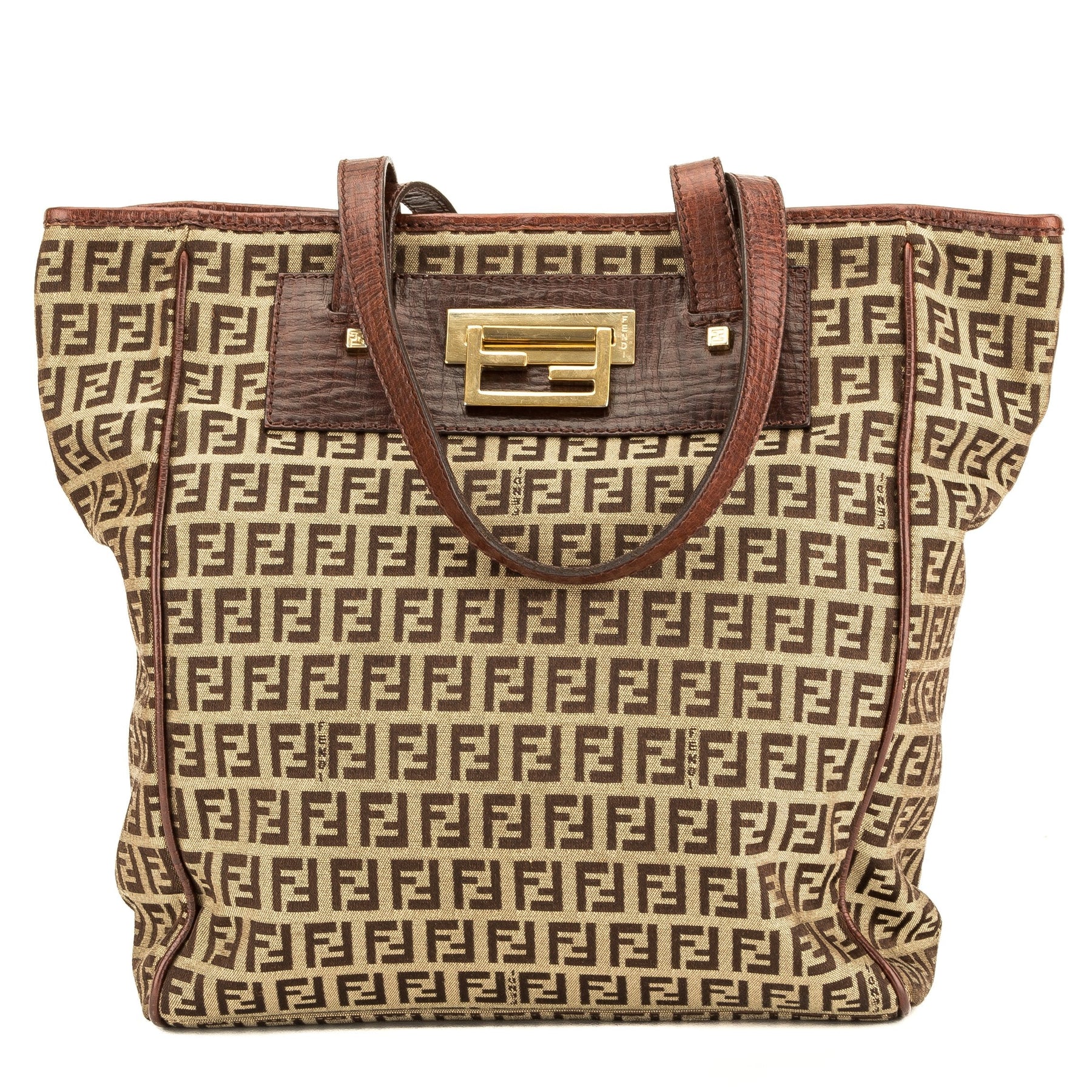 This is an authentic, pre-owned FENDI Tote Bag. This is a chic Fendi handbag for any occasion. It features the Fendi Zucca canvas with a brown leather trim, flat handles, and gold-tone hardware. The interior has a Fendi fabric lining with a snap pocket, space for necessities, and a Fendi metal tab closure. Made in Italy. This item is in good condition, it has scratches on the hardware, small discoloration on interior, hardly noticeable. See photos for details. Pay close attention to sizes and measurements.