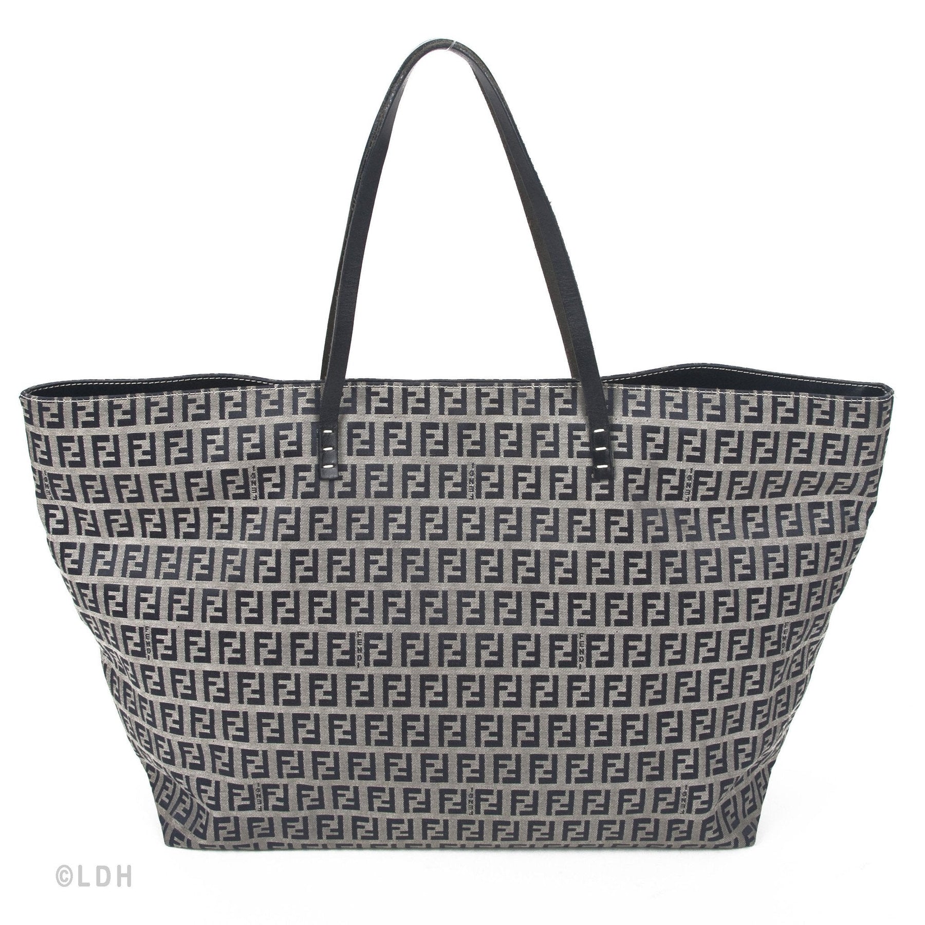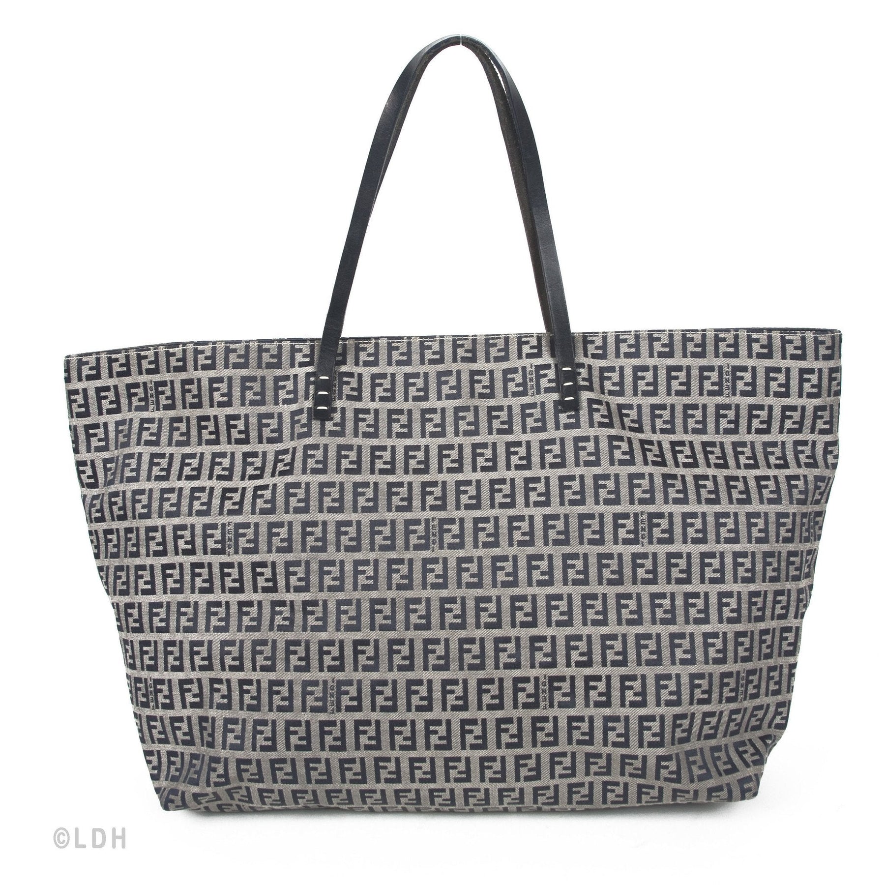 This authentic pre owned Fendi Zucca Tote features the classic FF mono exterior with blue leather trimmings one middle pocket with a zipper.