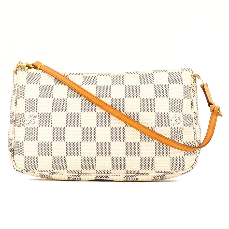 This is an authentic, pre-owned LOUIS VUITTON Pochette Accessoires Bag. It's the popular, petite tote. It features the beautiful Damier Azur canvas with a detachable vachetta leather strap to carry as a tote or clutch. It has a beige textile lining with space for your small necessities and a gold-tone zip closure. It's the perfect handbag for any occasion. This item is in good condition, will have visible signs of wear and/or use. Please view photos carefully for details. Pay close attention to sizes and measurements.