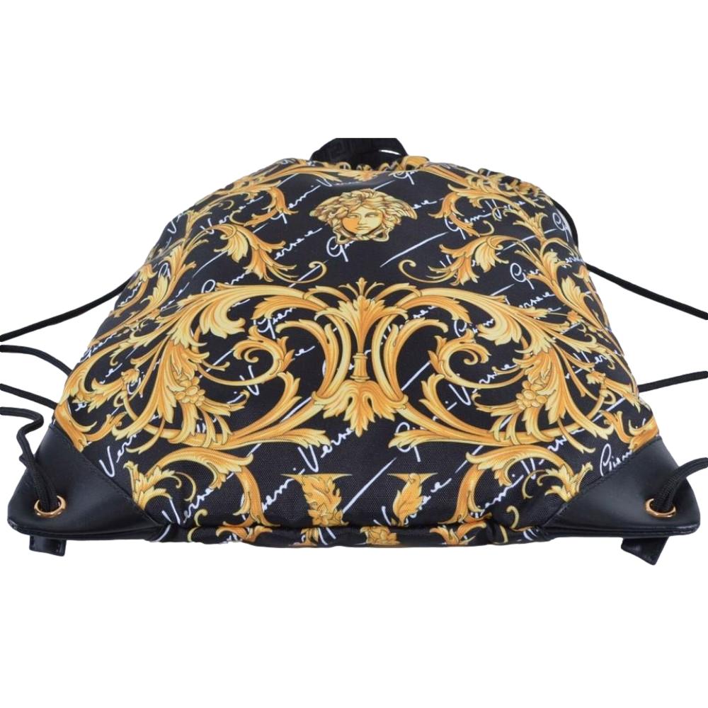 This backpack from Versace is crafted of gold "Baroque" printed black nylon backpack. The drawstring fastening opens to a black nylon interior lining with a zipper pocket. Add stylish flare to any on-the-go look with this highly functional backpack, only from Versace.