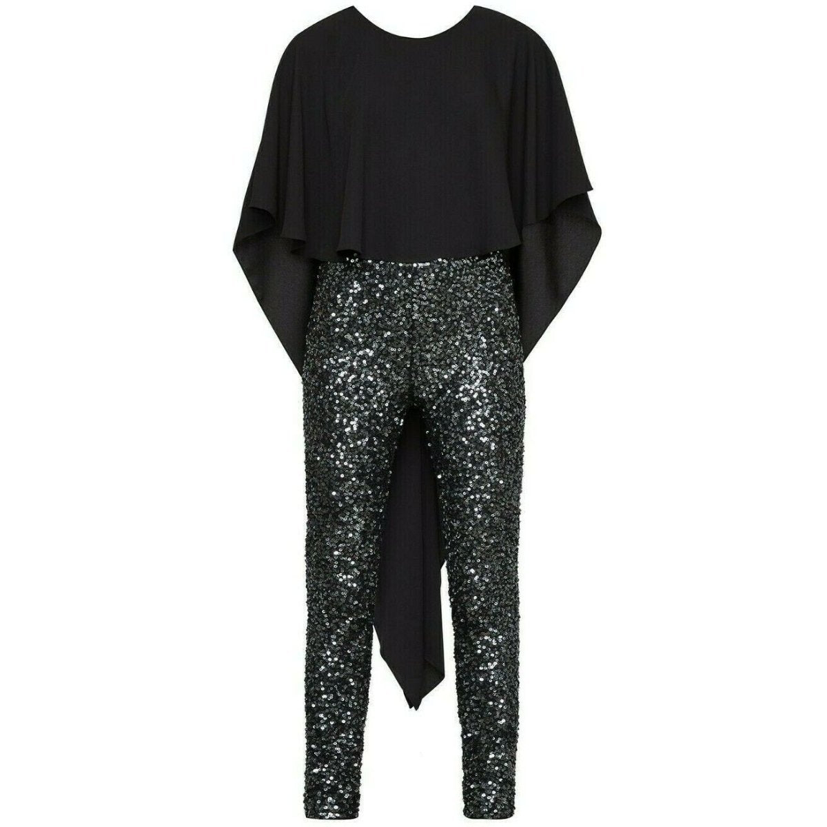 Dazzle in this deep V-back jumpsuit accented with a shimmering sequin skinny pant. The elegant capelet top features three-quarter-length sleeves and a draped back