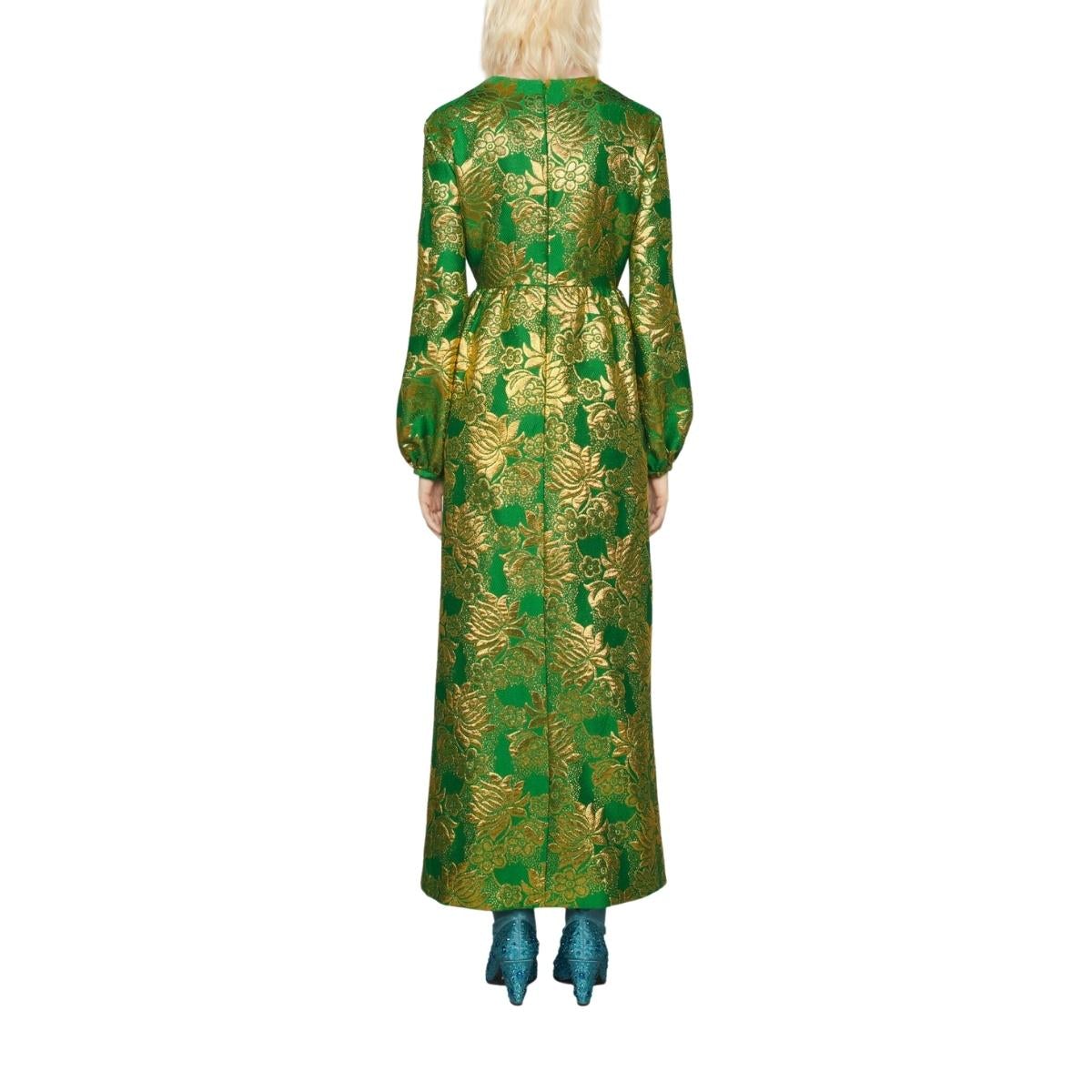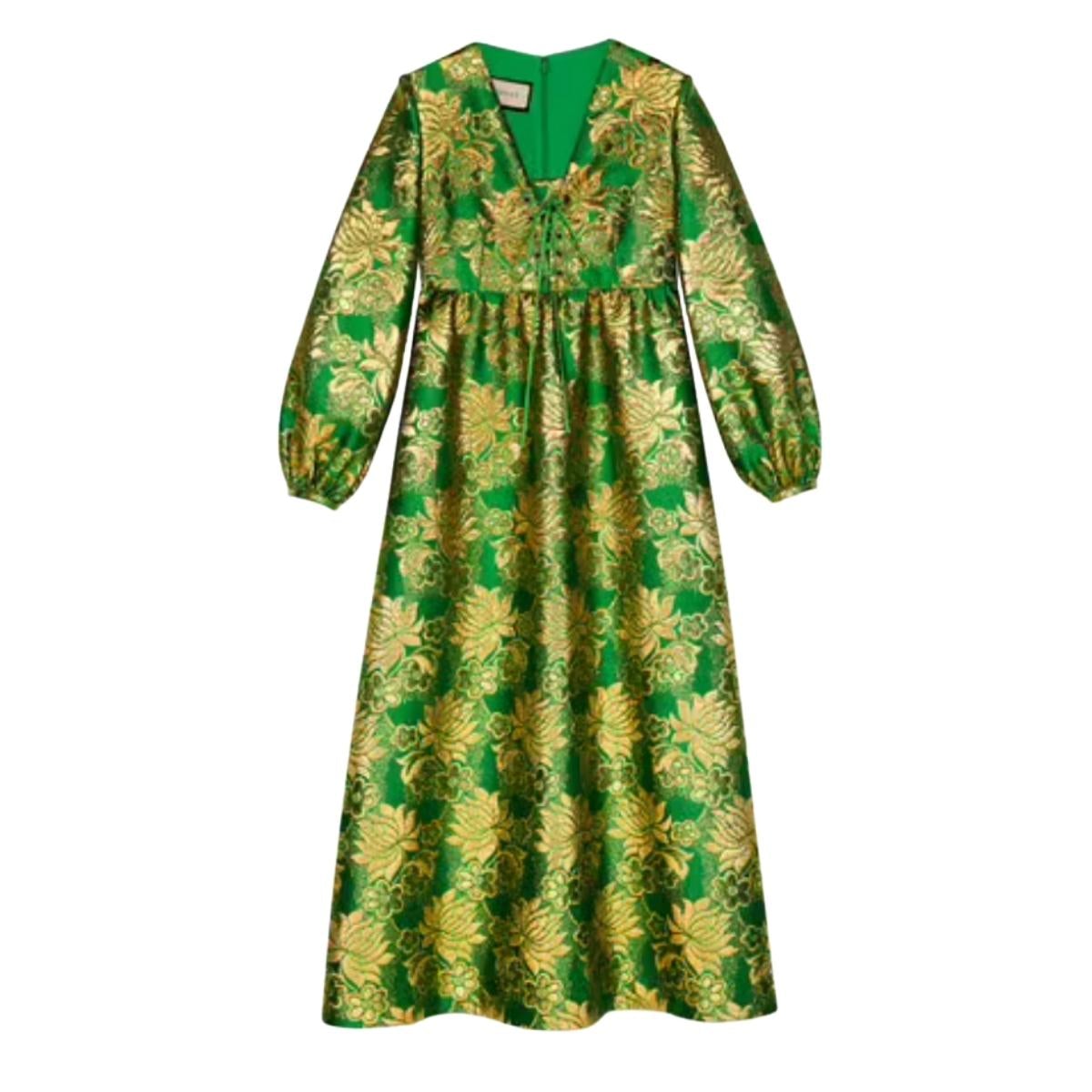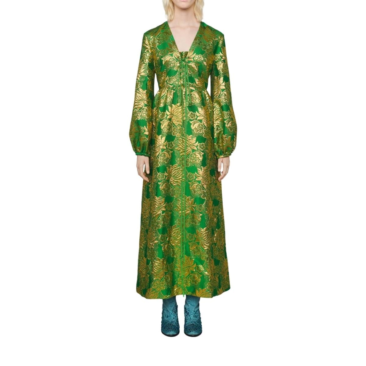 Green and gold floral patterned wool is punctuated by lamé detail on this front tie gown. Rich in pattern and decoration